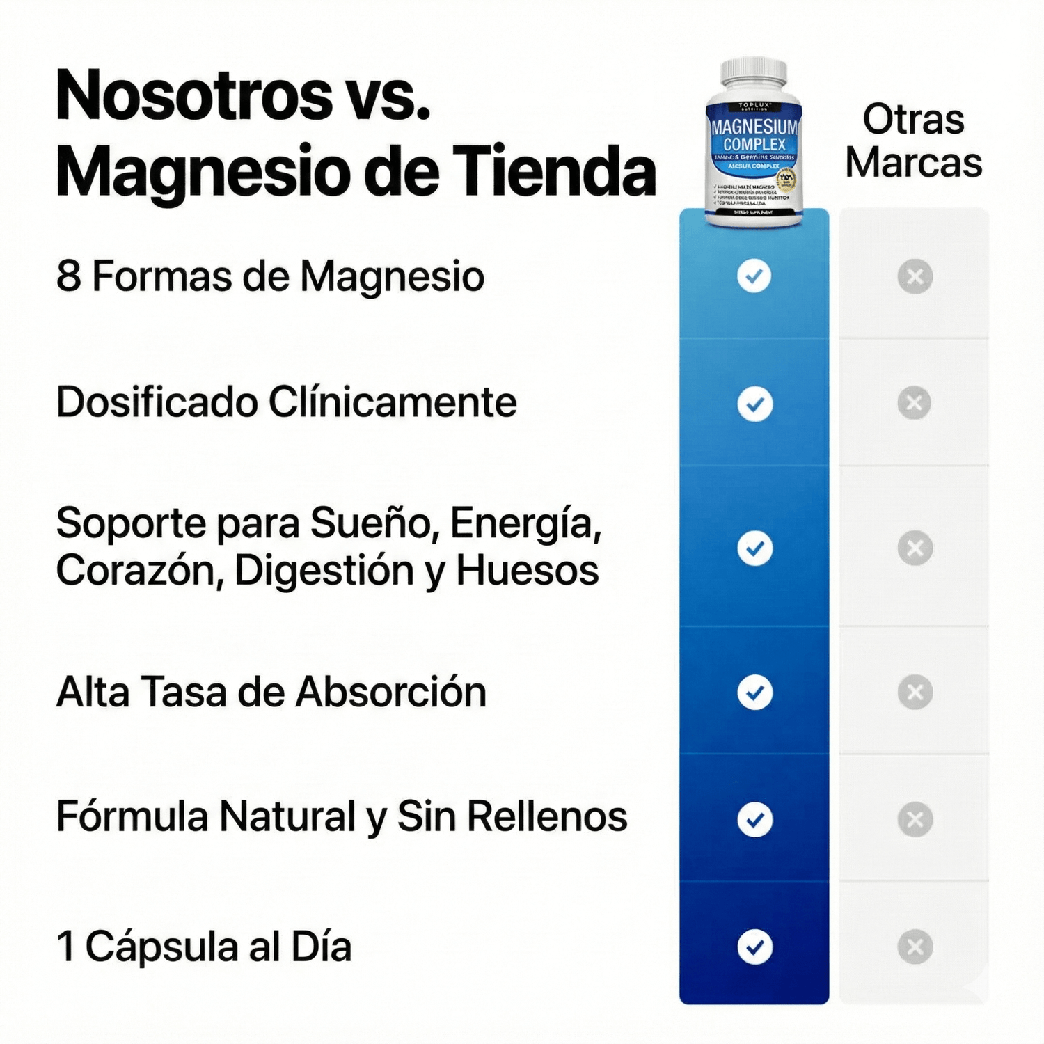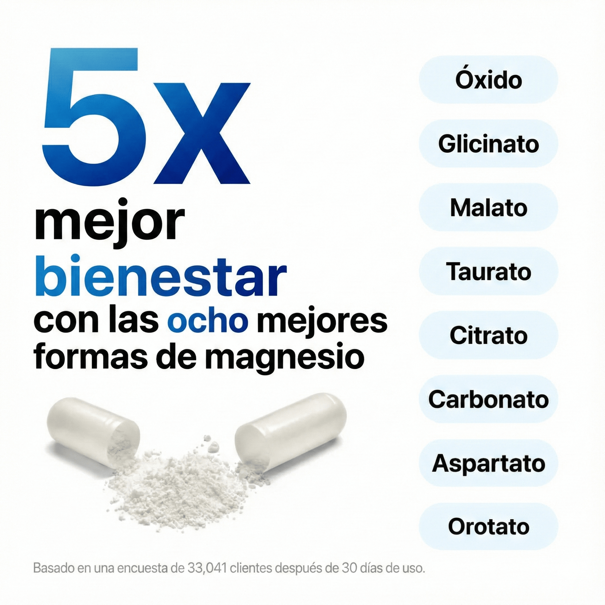 A diferencia de otros suplementos de magnesio que tu cuerpo no puede absorber, esta fórmula te brinda las 8 formas más importantes de magnesio — en la calidad más pura y las cantidades adecuadas que tu cuerpo necesita.